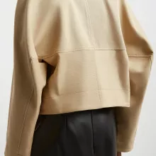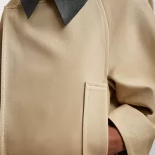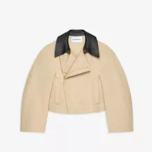 Constructed from a high-quality mix of 76% cotton and 24% wool, with a 100% cotton inner lining, this jacket promises warmth and comfort without compromising on style. The contrasting leather collar adds a touch of sophistication, creating a striking contrast with the soft fabric texture. The bias-cut seams are thoughtfully designed to create an enveloping, flattering volume that enhances the jacket’s contemporary, oversized fit. This is not just a jacket, it’s an experience in refined fashion.
