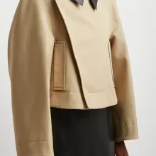 What sets this jacket apart is its unique blend of classic tailoring and contemporary design. The leather collar adds an extra layer of sophistication, while the bias-cut seams create a flattering, voluminous silhouette. This piece is more than just outerwear—it’s a statement of modern luxury and style. It’s the perfect addition to any fashion-forward wardrobe.